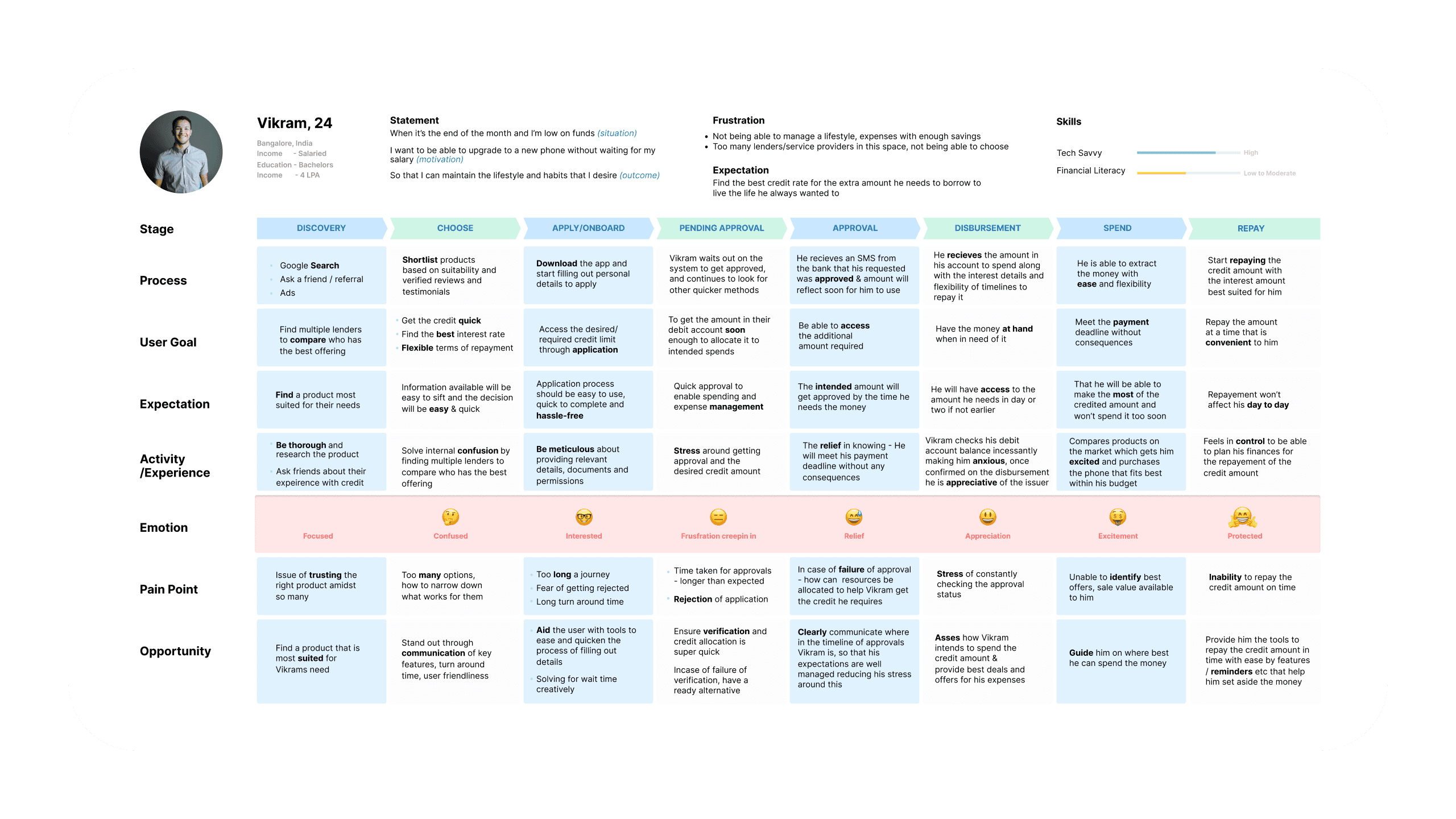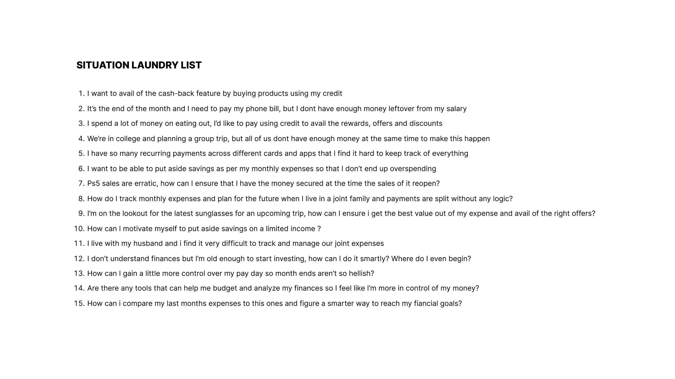 This approach helped us move beyond “loan use cases” and design for broader lifestyle needs whether it was managing end-of-month cash flow, handling emergencies, tracking spending, or making thoughtful purchases. Below are a few representative examples that informed core product decisions, flows, and feature prioritization.